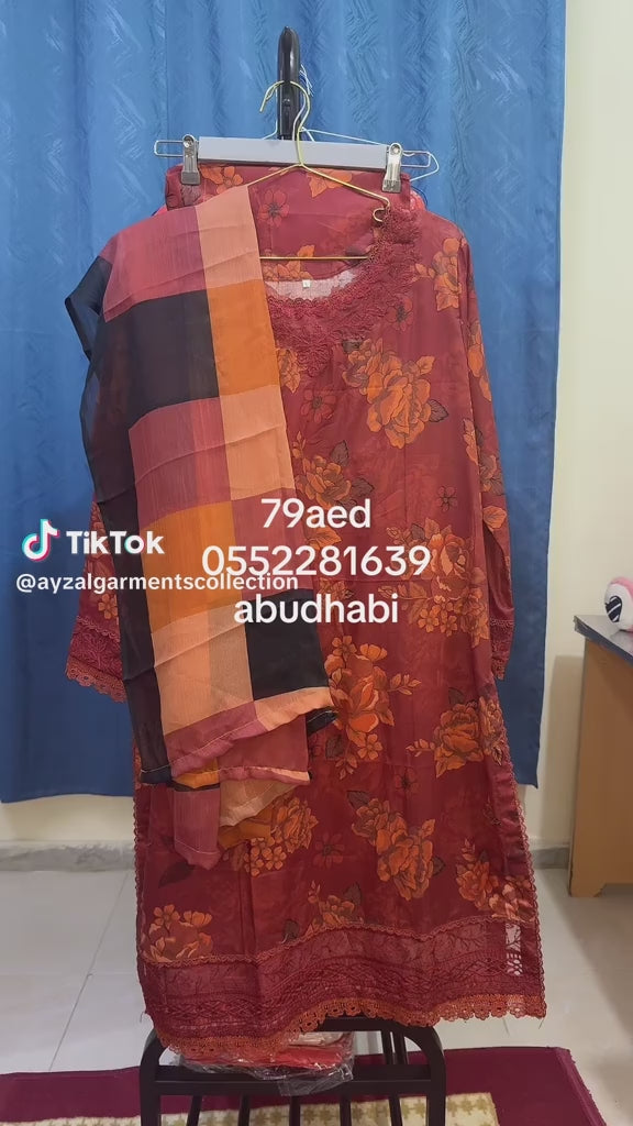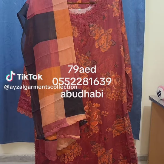 3 pc Lawn Suit with chiffon dupatta long sleeve Maroon color